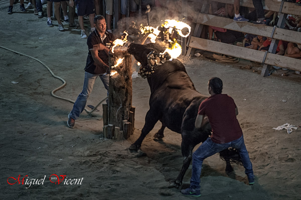 Aunque no soy fans de los festejos taurinos, durante los días del 18 al 22 de Agosto, la población de Castellnovo celebra sus festejos taurinos, así que aprovechando un balcón de privilegio al que puedo acceder en la plaza de la población, os paso una foto del pasado jueves del toro embolado.